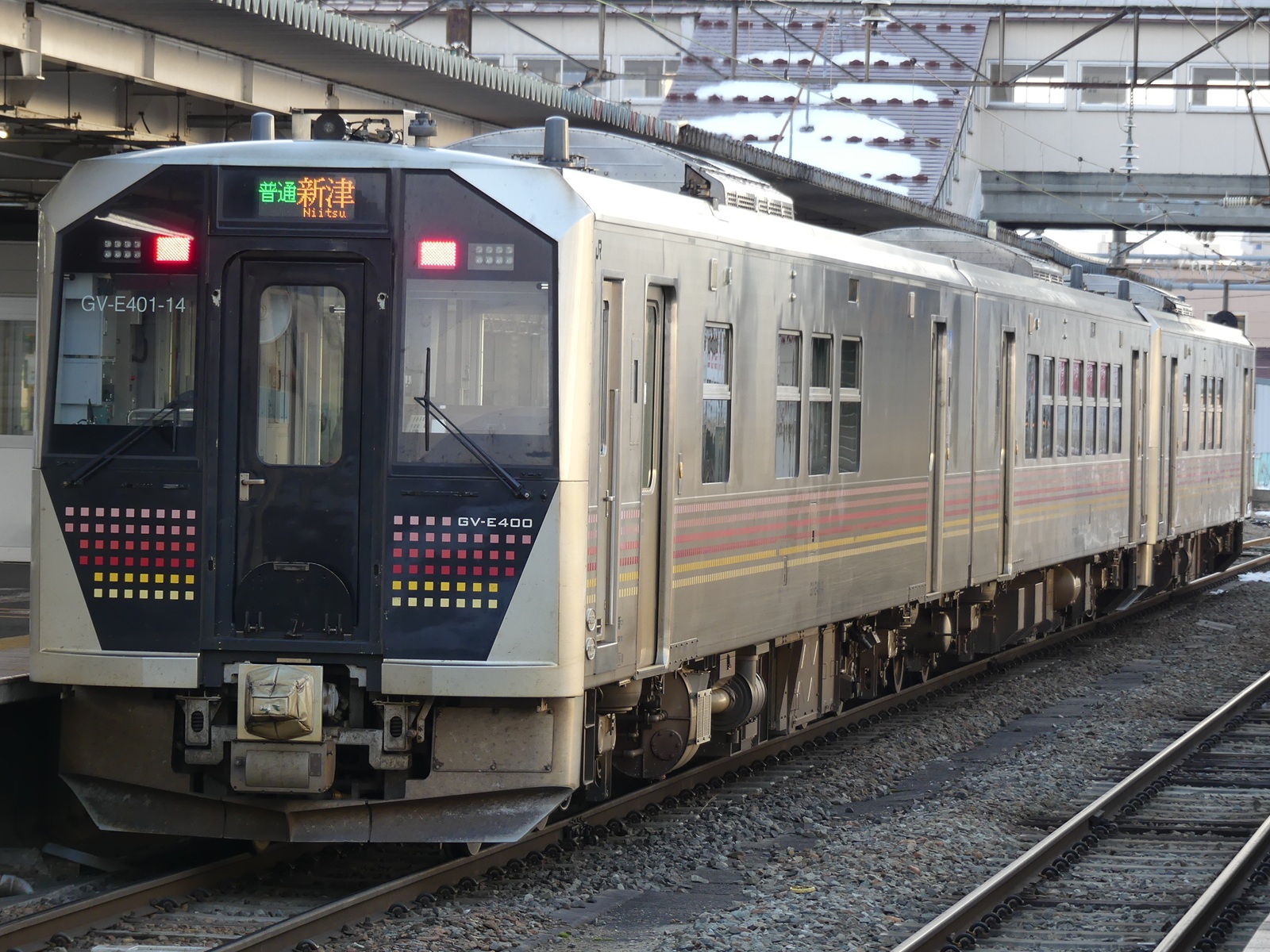 2018年登場。老朽化が進んでいたキハ40形等の在来気動車の置き換えを目的に導入された車両である。形式のGVは「Generating Vehicle」の略であり、即ちエンジンで発電した電力により走行を賄う「電気式気動車」である。車体は全長19.5m級の軽量ステンレス製で、正面は併結を考慮した前面貫通構造となり、かつ多角的なデザインとなっている。側扉は片開き扉が2か所に設けられており、押しボタンによる半自動扱いに対応している。本形式は新潟地区と秋田地区にそれぞれ導入されたが、前面・側面窓下に配された帯は新潟地区向けが濃淡ピンク・濃淡黄色かつドット状、秋田地区向けが白と青のグラデーションとなっている。前述のとおり本形式は電気式気動車であり、エンジンで発電した電力を、コンバータ・インバータ・補助電源装置を内包した主変換装置を介して動力としてモーターに伝達する機構を有している。インバータはハイブリッドSiCを素子に用いたVVVFインバーターが採用され、主電動機に全閉式誘導電動機を導入することで、メンテナンス性を向上させている。ブレーキは電気指令式ブレーキで、抑速ブレーキの他寒冷地を走行することから耐雪ブレーキも備える。営業運転上の最高時速は100q/hとした。主幹制御器は左手操作式のワンハンドルマスコンハンドルで、操作性は近年製造されている電車に準じている。モニタ装置は車両情報管理と乗務員支援を兼ねており、車両情報のリアルタイム管理や空調の自動制御、ワンマン・ツーマン運転の設定などが行える。基幹電送として大容量の情報が伝送可能なイーサネットが採用されている。車内はロングシート比率の高いセミクロスシートとなっている。クロスシート部分は2人掛け+4人掛けのボックスシートとなっている。ロングシートの端部は風よけを兼ねた大型の袖仕切りが設置された。両運転台のGV-E400形及び片運転台のGV-E401形の乗降扉後部には車いす対応のトイレと車椅子スペースが設けられている。車内照明は全てLED化されている。なお、機器室設置のため一部はデッドスペースとなっている。ワンマン運転にも対応し、乗務員室仕切り部分には運賃表示型の液晶表示器を備える他、運賃箱や整理券発行機、車内確認用のカメラも備える。GV-E400形はまず2018年に量産先行車として3両が製造され、性能確認の後2019年から量産車が投入され、同年8月より新潟地区で営業運転を開始した。新潟地区では2020年までに1両単行が8両と2連が16本の40両の陣容となり、同地区に在籍していたキハ40系列を一掃している。次いで2020年からは秋田地区にも導入され、こちらは2021年までに1両単行が11両、2連が6本の23両が導入された。2020年12月から営業運転を開始しており、こちらもキハ40系列を一掃した。災害による路線不通の影響で使用線区は流動的になっているが、新潟地区では主に磐越西線、秋田地区では主に五能線で主力車両として用いられている。秋田所属車はかつて津軽線にも充当されたが、蟹田以北が不通となったことで撤退しており、反面2025年からは奥羽本線新庄以北でも用いられることとなっている。
