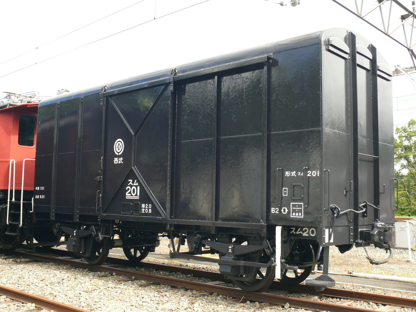 スム201形は袋詰めセメントや生石灰を輸送する目的で1960年から製造が開始された、15t積みの鉄側有蓋車である。国鉄が1953年から製造していた鉄製有蓋車テム100形の同型車で、車体形状は同形式に酷似しているが、こちらは妻面に通風器を3か所備えており、外観上の特徴となっている。なお、こちらの製造は全て西武所沢車両工場である。国鉄テム100形と同様、当時の走り装置は1段リンク式で、最高時速は65km/hに抑えられていた。スム201形は1962年までに45両が製造され、同年からは国鉄テム300形同様に当初から走り装置が2段リンク式となり、最高時速75km/hに向上したスム301形の製造に移行したが、本形式とスム301形のいずれも国鉄直通に対応しており、識別のために車番表記の箇所に二重白線が引かれていた。1968年10月のダイヤ改正で国鉄の貨物列車の殆どで最高時速が75km/hに引き上げられることにあわせ、本形式も半数近い20両で走り装置が2段リンク化され、最高時速が75km/hに引き上げられている。なお、本形式の元となった国鉄テム100形は同様の改造を受けた後テム300形へ編入されたが、こちらは改造後も元の形式を維持していた。前述のとおり袋詰めセメントや生石灰の輸送に用いられ、国鉄にも直通した車両だが、貨物輸送全体の衰退を受け、西武鉄道の貨物輸送全廃よりも前に本線上からその姿を消している。スム201号車が現在も横瀬車両基地内に他の機関車等と一緒に保存されており、往時の貨物輸送をしのぶことができる。