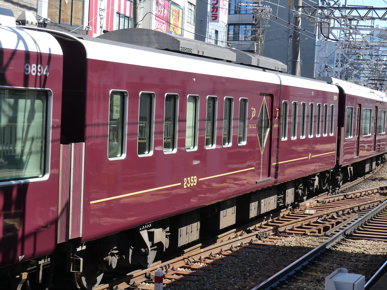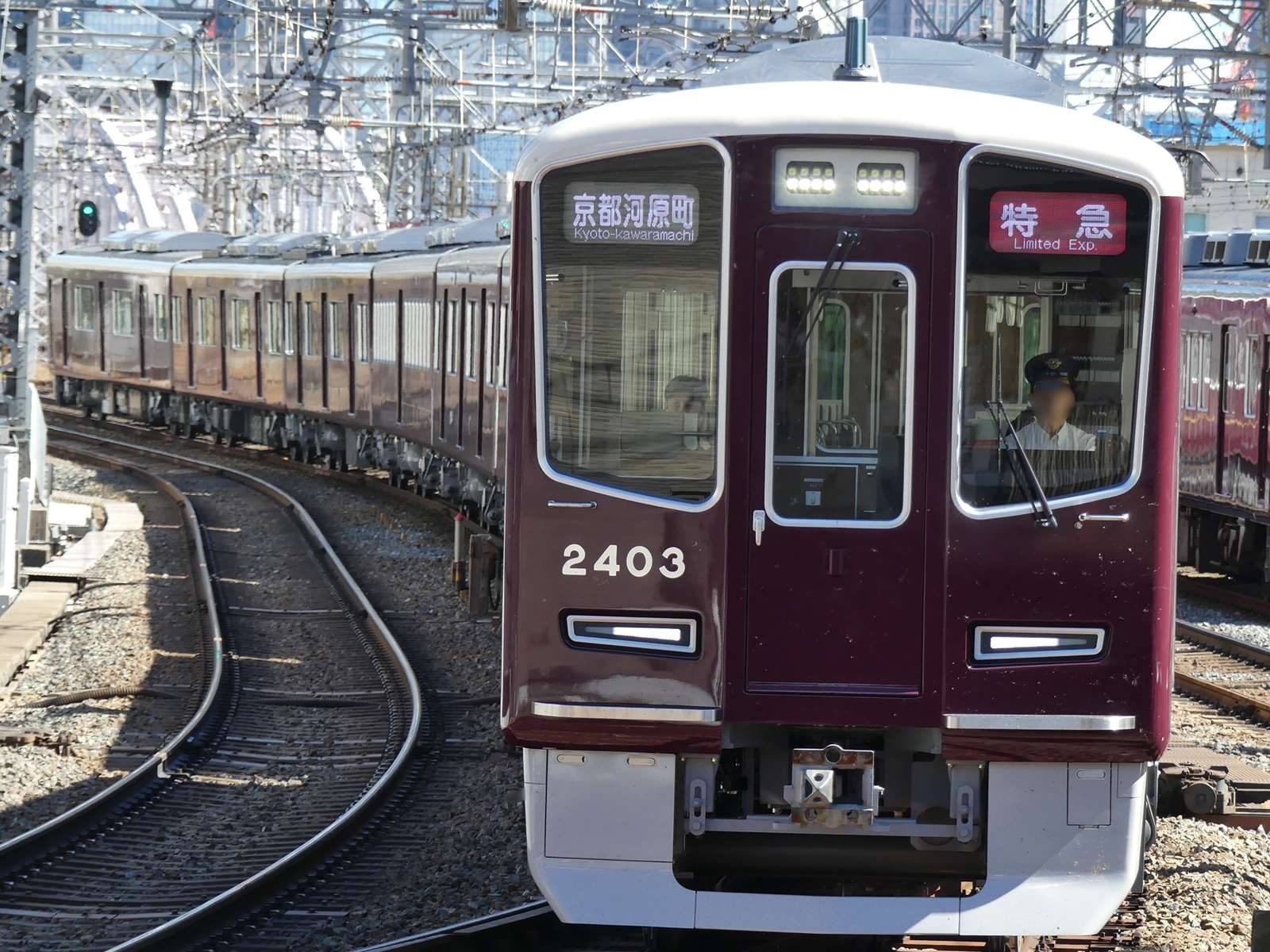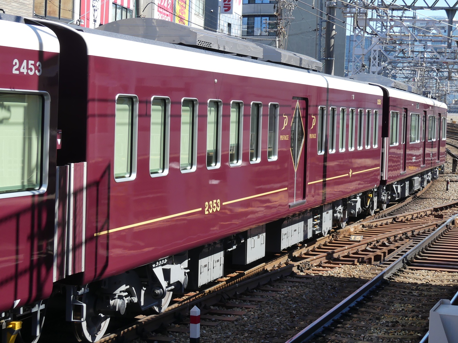 2300系は2024年に登場した、9300系以来となる京都線系統の特急型車両である。「安心と快適、そして環境に配慮した新しい阪急スタイル」というコンセプトのもと開発された。車体は日立製作所製で、それまで製造されていた1300系と同様軽量アルミ合金製の車体となっている。デザインも概ね1300系を踏襲しているが、前面の窓ガラスに曲線を取り入れることで、疾走感を表現したデザインとなっている。また窓下の前照灯・尾灯の形状も変更されてより細型となり、より精悍な印象となった。9300系と同じく8両で1編成を組み、中間車にはかつての特急型車両である2800系と同一車番が付番された車両も存在する。制御方式はハイブリッドSiC-VVVFインバーター制御が採用されており、高効率化により消費電力量の削減が図られている。車両情報システムは1300系で採用されているものから更に発展し、力行・制動を含めた制御・モニタリングやサービス機器類の制御を一元的に管理し、車両情報をリアルタイムでクラウドサーバーに蓄積可能な「TCMS」と称されるものが採用されている。これにより、主幹制御器の無接点化がなされており保守性の向上、機器類の小型化が図られた。また同機構の採用により、運転台は阪急では初となるグラスコクピットとなった。一般車両の車内は9300系を踏襲し、扉間は転換クロスシート(扉付近のみ固定)、車端部はロングシートというセミクロスシートの構成となっている。ロングシート部分の袖仕切りは半透明のガラスが取り入れられ大型化された。優先席はモケットのみならずつり革の革部分も識別のためマゼンタ色となっている。車椅子スペースは既存車に比べ拡大され、腰当てや車椅子固定具も設置されている。更に阪急では初めて空気清浄機を搭載し、空調も阪急として初めて省エネルギー性能と静音性に優れたインバータ式空調装置が採用された。扉鴨居部には32インチハーフサイズの液晶車内案内表示器が千鳥配置されている他、反対側の鴨居部には防犯カメラが設置されている。また、本形式を象徴するサービスとして、4号車に連結される有料座席指定車「PRiVACE」が挙げられる。阪急初の有料座席サービスとなるこの車両は片側1扉かつ中間配置という特別車両で、車内は2+1人掛けのリクライニングシートが1050oピッチで展開し、色調こそ阪急伝統のものとなっているが、2人掛け席であってもパーテーションによる仕切りを取り入れる等、プライベート感に重きを置いた設計となっている。付帯設備もコンセント、インアームテーブル、読書灯等があり、更に1席につき1つ窓が設けられるなど、JRのグリーン車を凌ぐほど充実した内装となっている。この2300系は2024年7月に営業運転を開始し、同時に有料座席指定車「PRiVACE」のサービスも開始された(暫定的に「PRiVACE」のみ先行作成し、9300系にも連結してのサービス開始となった)。最終的には9300系と同本数が製造され、特急運用から外れる9300系を一般車に転用したうえ、玉突きで経年が進んだ車両を置き換える予定となっている。