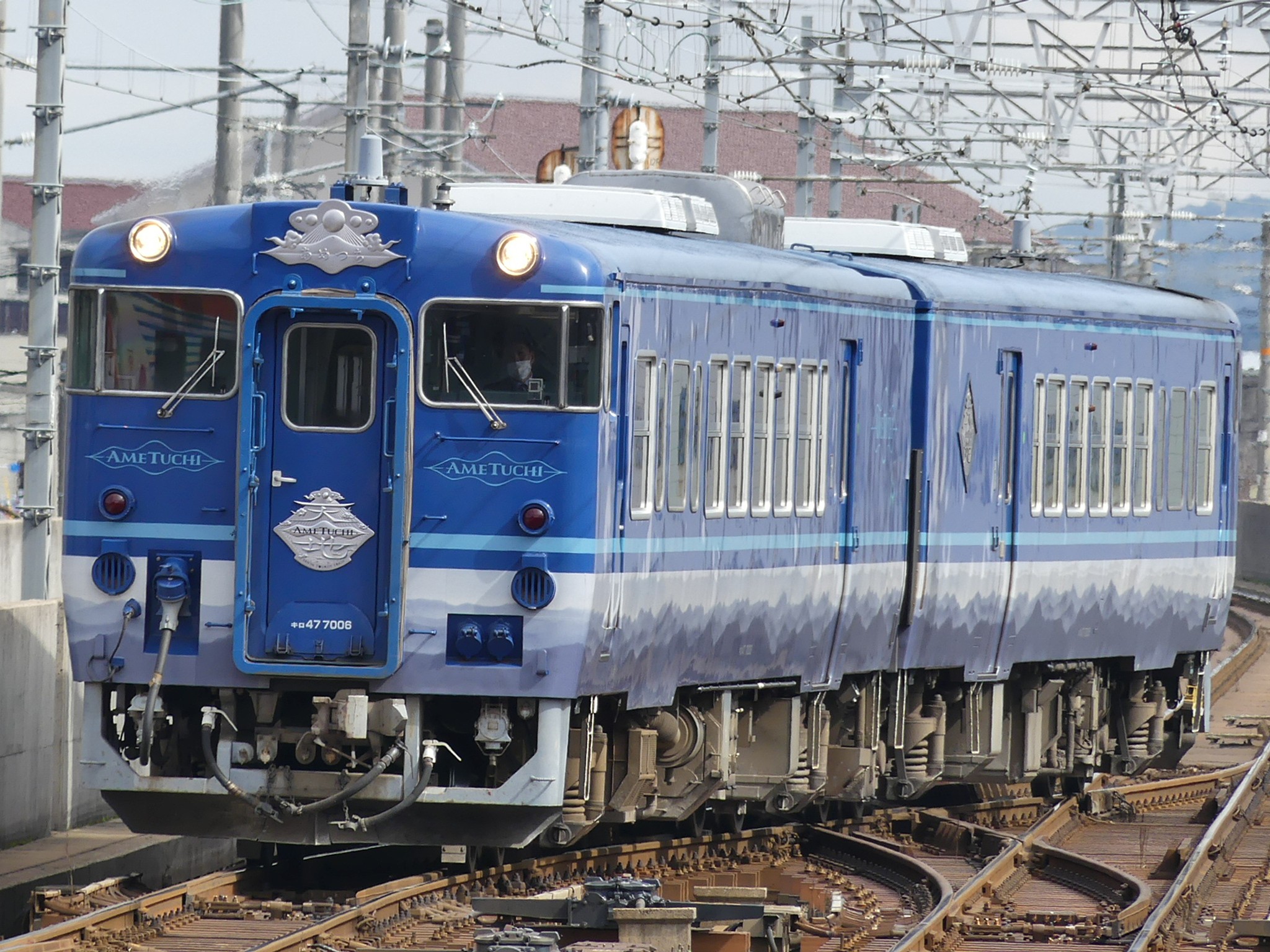 キハ47形「あめつち」は、2018年の「山陰デスティネーションキャンペーン」にあわせて導入された観光列車で、キハ47形2両を種車に改造が施されている。名前は古事記の冒頭部に由来し、神話の多い山陰地方を運行することから「ネイティブ・ジャパニーズ」というコンセプトが取り入れられている。本車の総合ディレクターは島根県出身の錦織良成氏が担当し、車内の色彩を同じく島根県出身のアニメーター吉田昇氏が手掛けている。外装は「山陰の美しい空や海」を表現した「紺碧色」を基調とし、下部に「山並み」と「たたら製鉄に因んだ日本刀の刃文」を表した銀色の帯模様があしらわれている。前面の行き先表示器は埋められており、同所と貫通扉部分には専用のエンブレムが取り付けられている。側扉は前位側が埋められ、各車とも1か所のみとなった。車内は2人掛けのボックスシートと海側を向いたカウンターテーブルを中心とし、海側中間部に4人掛けボックスシートを設けたものとなっている。車端部は物販カウンターやサニタリースペースが設けられている。サニタリースペースは既存のものではなく新調されており、トイレの他、独立した洗面所が設けられた。全体的に木目調パネルを多用する等和を押し出した内装となっており、因州和紙を用いた照明カバー、テーブルの石州瓦、岩井窯を用いた洗面台、更には智頭杉、隠岐の黒松も装飾として用いられるなど、随所に山陰地方の名産品や工芸品が装飾や展示品として盛り込まれている。なお、本車はグリーン車扱いとなるため、車両形式は「キロ47形」と改められている。「あめつち」は2018年7月から営業運転を開始した。当初の運転区間は基本的に鳥取〜出雲市間のみであったが、2024年からは「奥出雲おろち号」に代わり木次線宍道〜出雲横田間(車両性能の都合で備後落合方面までは乗り入れない)での運行が開始された他、同年には更に城崎温泉〜鳥取間でも新たに運行されるようになる等、範囲が広がりつつある。