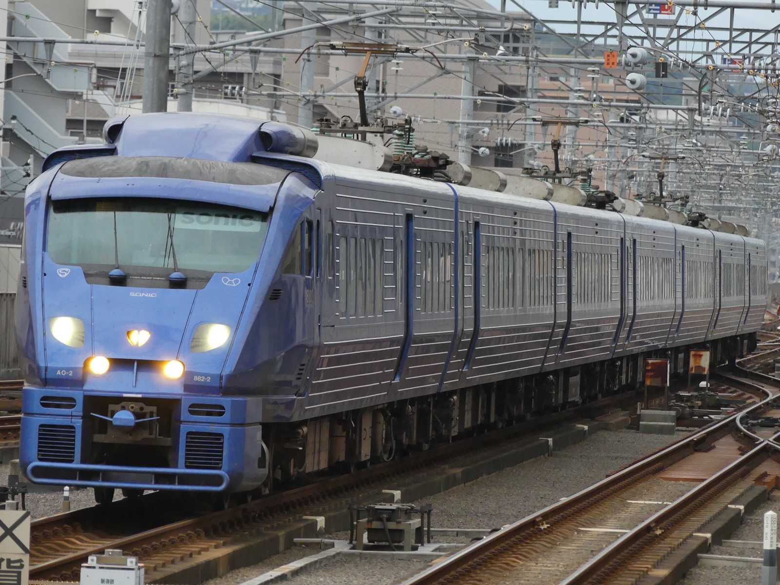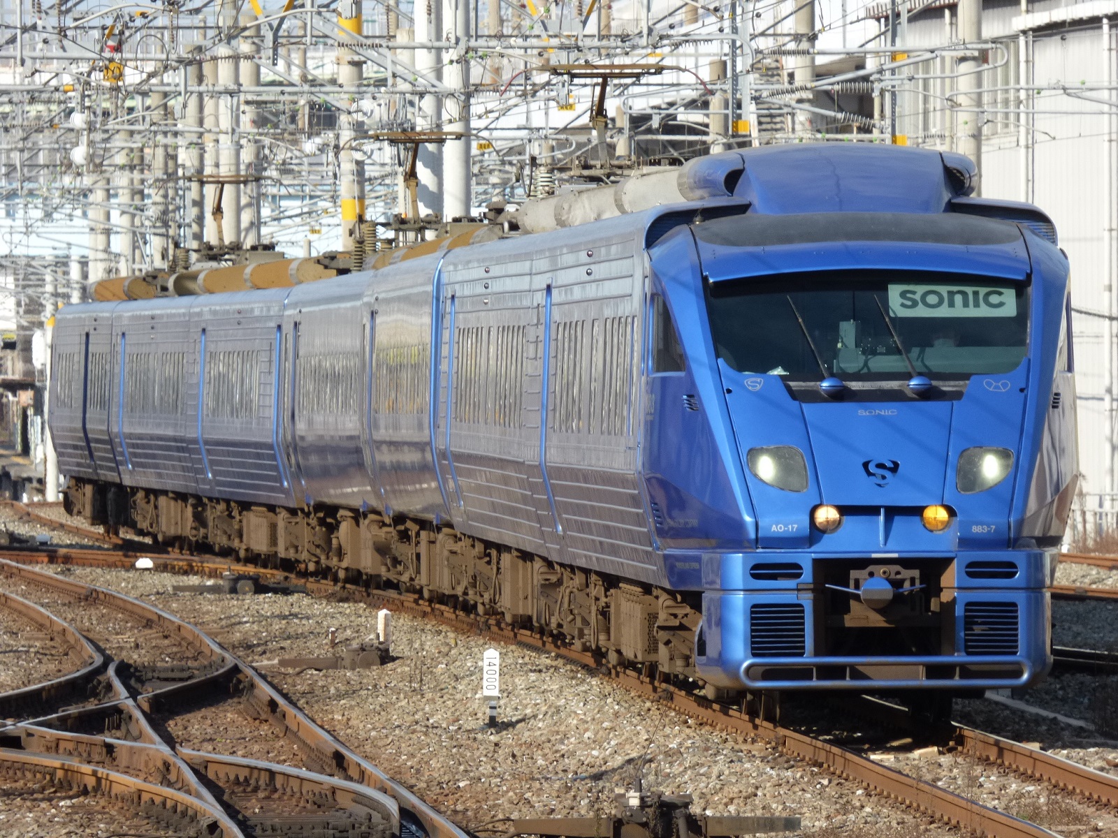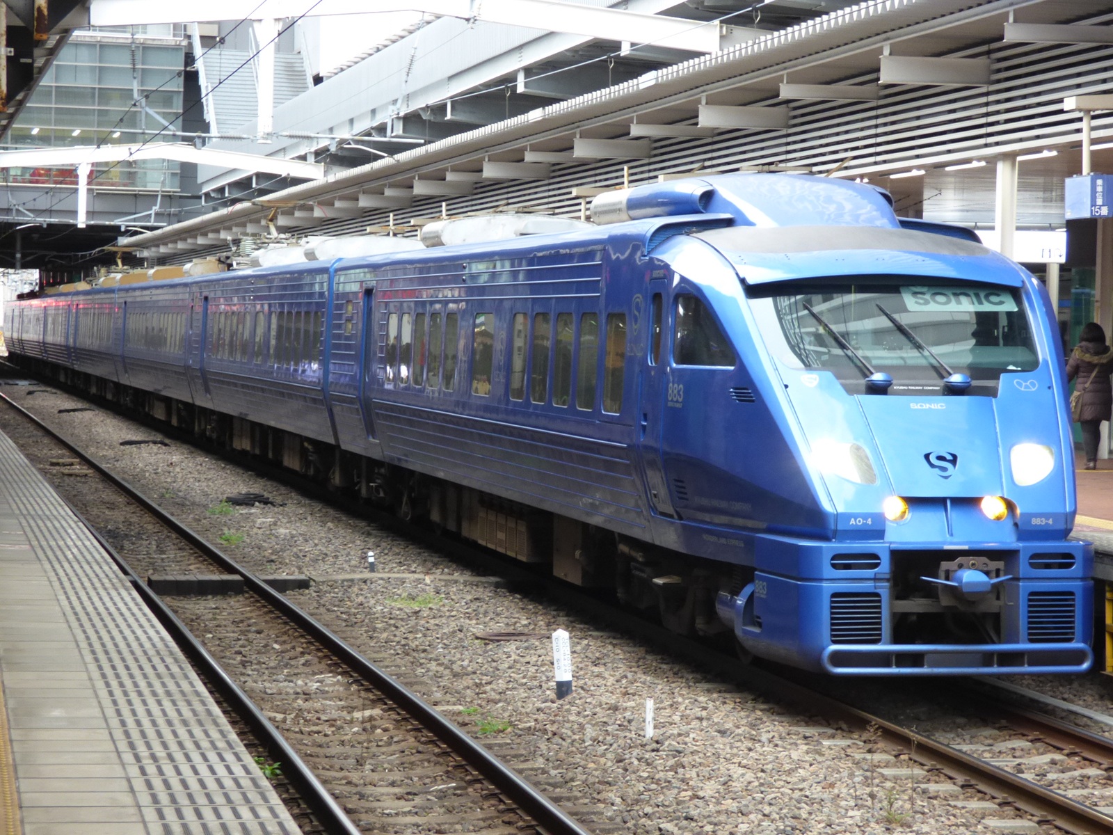 1994年登場。大分自動車道の延伸とそれに伴う高速バス等の台頭に対抗するため、日豊本線系統の特急列車の体質改善・高速化を図ることとなり開発された特急型車両である。787系に続き、トータルデザインは水戸岡鋭治氏が担当している。車体は前頭部を除き軽量ステンレス製で、前頭部は普通鋼製である。本形式は日豊本線のイメージアップを図り、ポップカルチャーの要素を取り入れ、「ワンダーランドエクスプレス」というコンセプトをもとにデザインされている。ステンレス部分は無塗装を基調とし、前頭部と側扉はセルリアンブルーメタリックに塗装された。前面はヨーロッパのトラック等をイメージした3字曲線を取り入れた特徴的なデザインとなり、取り外し可能なパネルを中央に据え付けた。実用本位ではなく装飾目的でバックミラーや円筒が設置されており、787系とも大きく異なる印象となった。日豊本線は曲線が多い路線特性から、所要時間短縮を図るために制御付き自然振り子方式を採用した振り子式車両となったが、これはJR九州で初の導入であると共に、交流専用車両としても初の振り子式車両となった。また、高速走行時の蛇行動抑制のため台車にはヨーダンパが搭載されており、安定的な走行に寄与している。制御方式はJR九州の特急型車両として初めてVVVFインバーター制御方式を採用し、主電動機出力を増強したこともあり、最高時速は130km/hとなった。これらの機構により、博多大分間の所要時間は485系時代と比べ30分以上もの短縮を実現した。なお、回生ブレーキは搭載せず、制動は発電ブレーキとなっているため別途抵抗器を搭載する。列車内を一つの「アミューズメントパーク」に見立ててデザインされており、デッキやトイレの壁面は着色されたアルミパネルが用いられている他、デッキにはオブジェ等が飾られるショーウィンドウが設けられている。また一部の車端部には「コモンスペース」と称されるフリースペースや、小カウンターが設置されている。グリーン車の運転台側は専用のパノラマキャビンが設置されている。客室部分は大分・博多方制御車(クロハ882形)の半室が1+2人掛けのグリーン車である以外は2+2人掛けの普通車(大半の車両の中間部分はセミコンパートメント)となっていた。グリーン車は鉄道車両としては初めて本格的に本革が表皮に採用されており、グリーン車の座席色こそ黒色だが、それ以外のカラーリングについては、幾何学模様のカーペット、座席モケット、ヘッドレスト等非常にカラフルとなっていた。特にヘッドレストについては某キャラクターの耳の形にもみえる独特なもので、また普通車は赤、緑、青の3色に配色されており、その点でも他に類をみない座席であった。総じて、正に「ワンダーランドエクスプレス」の名に違わない内装と言えるものであった。883系は1994年に7連2本、翌年に7連1本が投入され、この3本が1995年3月から営業運転を開始した。同年4月から本形式の充当列車は「ソニックにちりん」と区別された。1996年には7連2本、1997年には5連3本が増備され、1997年3月のダイヤ改正からは列車名が「ソニック」と改められた。増備時期により前面形状等が異なっている他、5連で製造された編成は編成ごとに前面の色が黄色、黒、銀とそれぞれ異なっており、彩りをそえた。883系は製造から10年が経過した2005年からリニューアルが開始され、「大人のWONDERLAND EXPRESS」というコンセプトに改められた。このリニューアルにより外装はステンレス鋼体を含めインディゴブルーメタリック1色に統一された。併せてバックミラーは撤去されている。内装も座席の特徴的なヘッドレストはそのままながら全体的にシックな装いとなり、床材も普通車はフローリングになる等印象が大きく変わっている。なお、クロハ882形(グリーン・普通合造車)には窓下にコンセントが追設された他、普通車のセミコンパートメントは通常座席に改められた。その後2008年には編成を7連に統一する目的で中間車ユニット3本が製造されたが、こちらは既に製造されていた885系をベースとした車両となり、1000番台に区分された。1000番台は内装も885系に近いもので、特徴的なヘッドレストは採用されていない。2025年の時点で初期車製造から30年が経過しているが、今もなお日豊本線系統のフラッグシップとして活躍を続けている。なお、885系とは異なり本形式はほぼ「ソニック」専属であり、他系統の特急には基本的に運用されない。