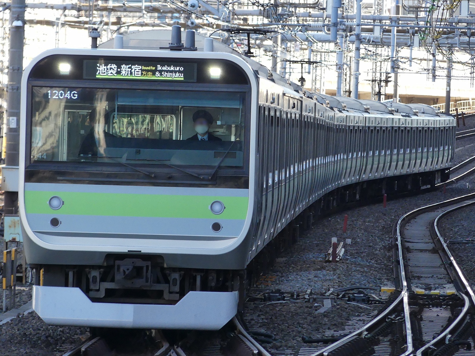 トウ04・05編成の10号車に連結されているサハE235形500番台。10号車は工事等で京浜東北線の車両が山手線の線路を走行することがあり、ホームドアの都合上中間車でありながら制御車と同じ扉配置になっている点が特徴である。