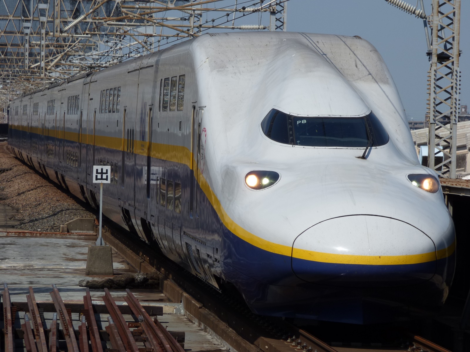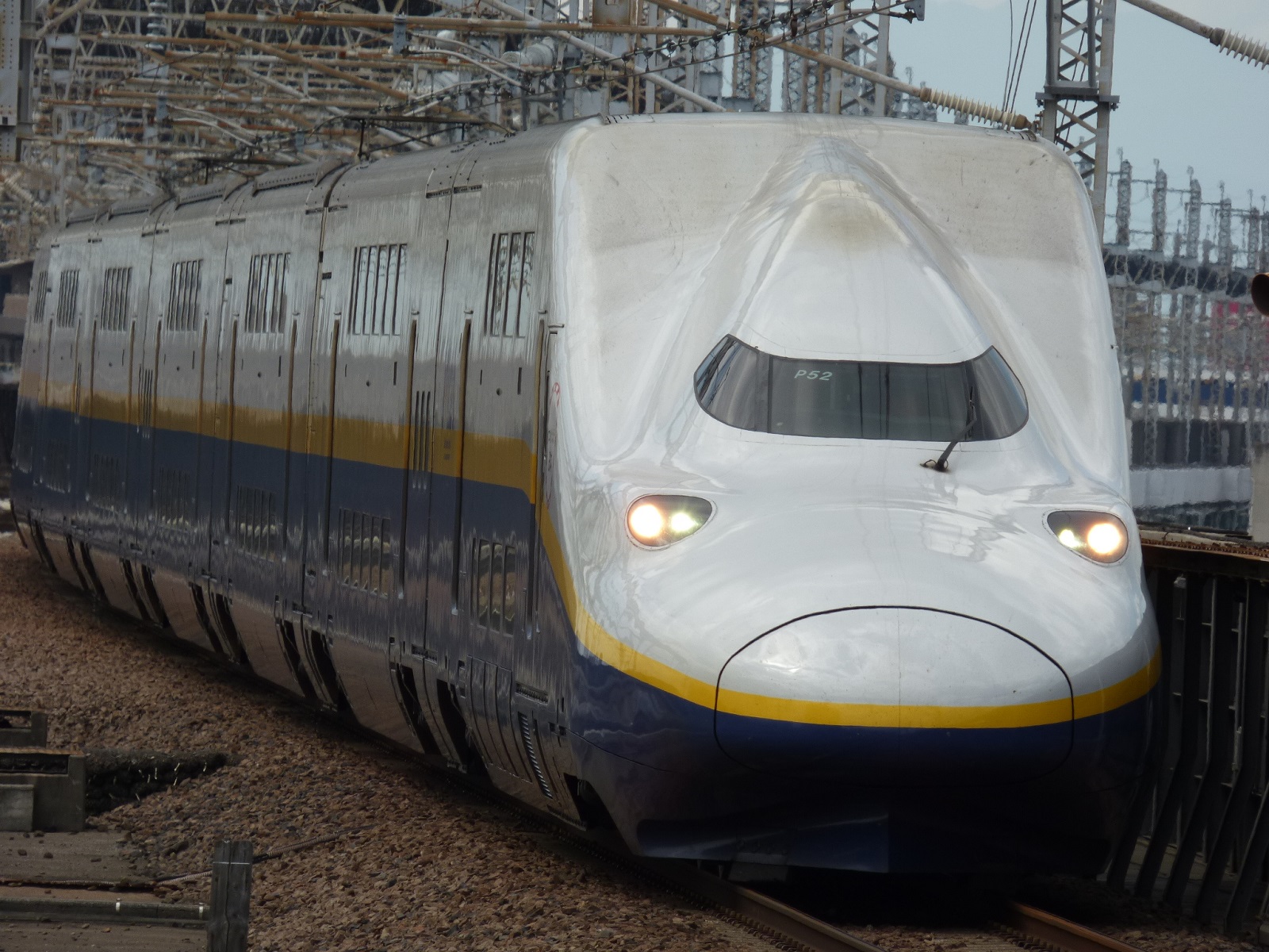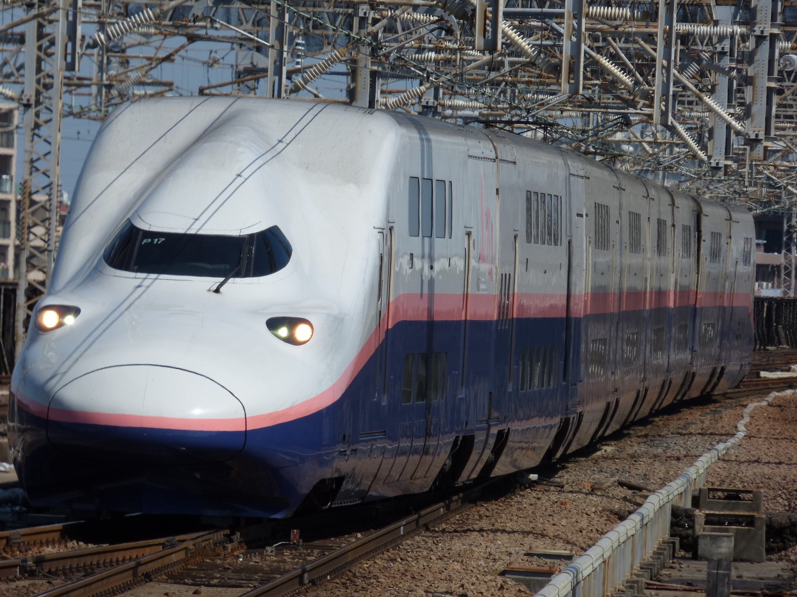 帯色が後年のE1系と同じ朱鷺ピンクに変更されたE4系。同系列は2012年以降上越新幹線専属となっており、それもあり2014年以降、新潟デスティネーションキャンペーンに合わせて、2016年以降残存した全編成がこの姿に改められている。ロゴマークもトキを描いたものに改められている。