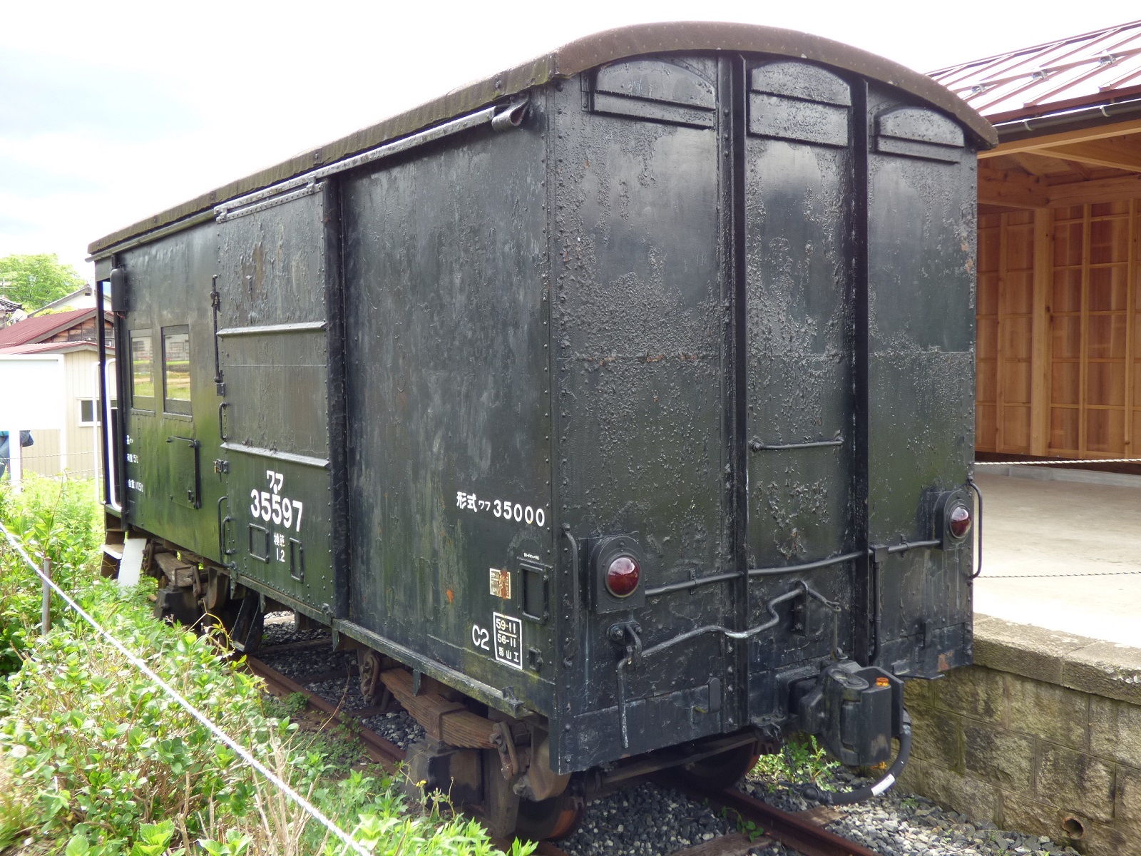 ワフ35000形は元はワフ25000形として製造されていた鋼製有蓋緩急車を、ワフ29500形と同様の車体に更新した車両である。本形式の前身となるワフ25000形は1933年から製造が開始された有蓋緩急車であった。戦前〜戦中期に製造された車両であり、貨物の輸送力に重きを置いて設計された。そのため有蓋緩急車ながら積載容量8tとなっているが、その分車掌室のスペースが非常に小さく、デッキレス構造であったため2つあった側窓の一つが乗務員扉を兼ねる有様であった。ワフ25000形の1代前に製造されたワフ21000形や戦後まもなく老朽緩急車の置き換えを目的に製造されたワフ22000形が対照的に車掌室が広くとられていたこともあり、戦後になると貨物列車車掌の乗務改善が求められるようになった。折しも1955年にワフ29500形が製造されるとワフ25000形の車掌室の居住性の悪さが更に際立ったため、1960年以降にワフ25000形をワフ29500形並みの車体に更新し、乗務環境の改善を図ることになった。この更新が施された車両がワフ35000形に改番されている。ワフ25000形は910両が製造されたが、このうち844両が1965年までにワフ35000形に改造されている。改造に際しては、ワフ25000形と同様デッキ付きとなり、積載荷重を5tに縮小することでその分車掌室のスペースを増大している。車掌室内にはダルマストーブが備え付けられたほか、車軸発電機も搭載され、それにより室内灯や埋め込み式の尾灯も設けられるなど、ワフ25000形と比べて大幅な居住性の向上を実現している。また、併せて台車を2段リンク式に改造し、最高時速が75km/hに引き上げられている。改造により、結果的にワフ29500形と酷似した外観になったが、荷物室側の側扉はこちらの方が大きく、デッキ付近の構造や側窓の数(ワフ29500形は片側3つ、片側2つだが、こちらは両側2つ)にも差異がある。貨物列車に車掌車連結が必須だった時代において有蓋緩急車は輸送力の低い地方線区を中心に重宝される存在であったが、モータリゼーションの進展や直行型輸送への切り替えにより貨物輸送そのものが減少になったことに加え、列車防護無線の発達により1985年3月のダイヤ改正で車掌車連結が原則廃止されると用途の喪失から余剰となり、国鉄分割民営化を待たずして全車廃車されている。このうちワフ35597号車は廃車後宇都宮貨物ターミナルに留置されていたが、2011年に若桜鉄道八東駅構内に移設されており、旧貨物ホームに現在も静態保存されている。