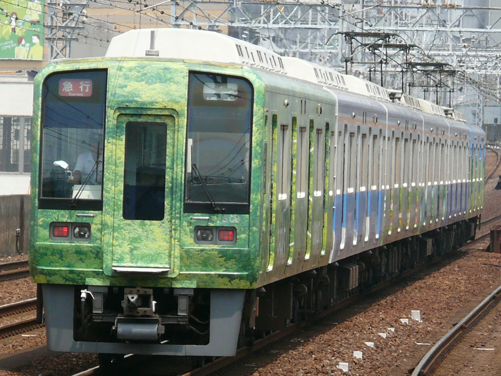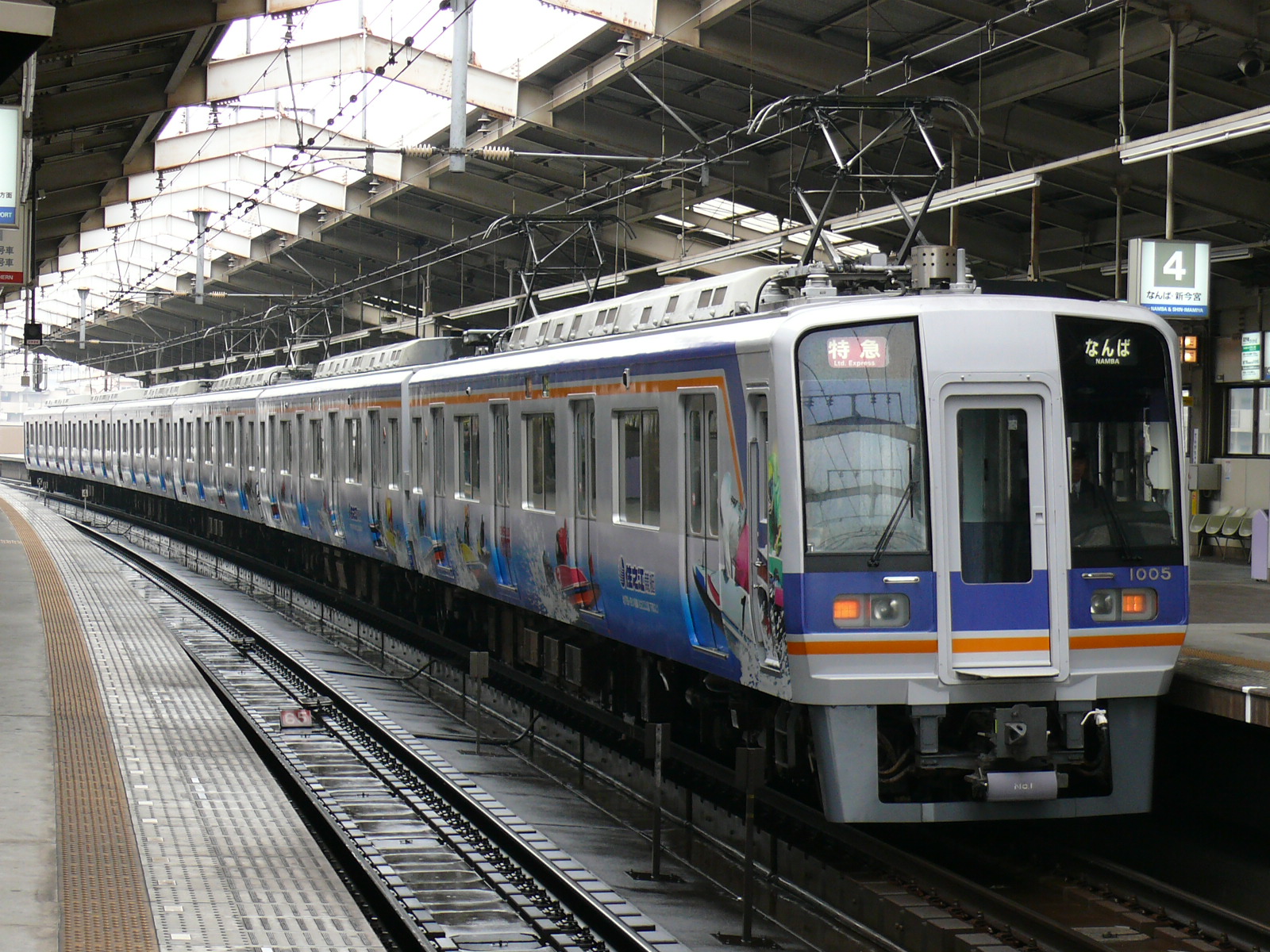 住之江競艇のラッピングが施されていた1005F。1994年製の車両からは建築限界の変更を反映し車体幅が2850oに拡大されている。なお、座席指定車を連結しない南海本線の「特急」は2012年まで定期運用が存在したが、現在は代走のみとなっている。