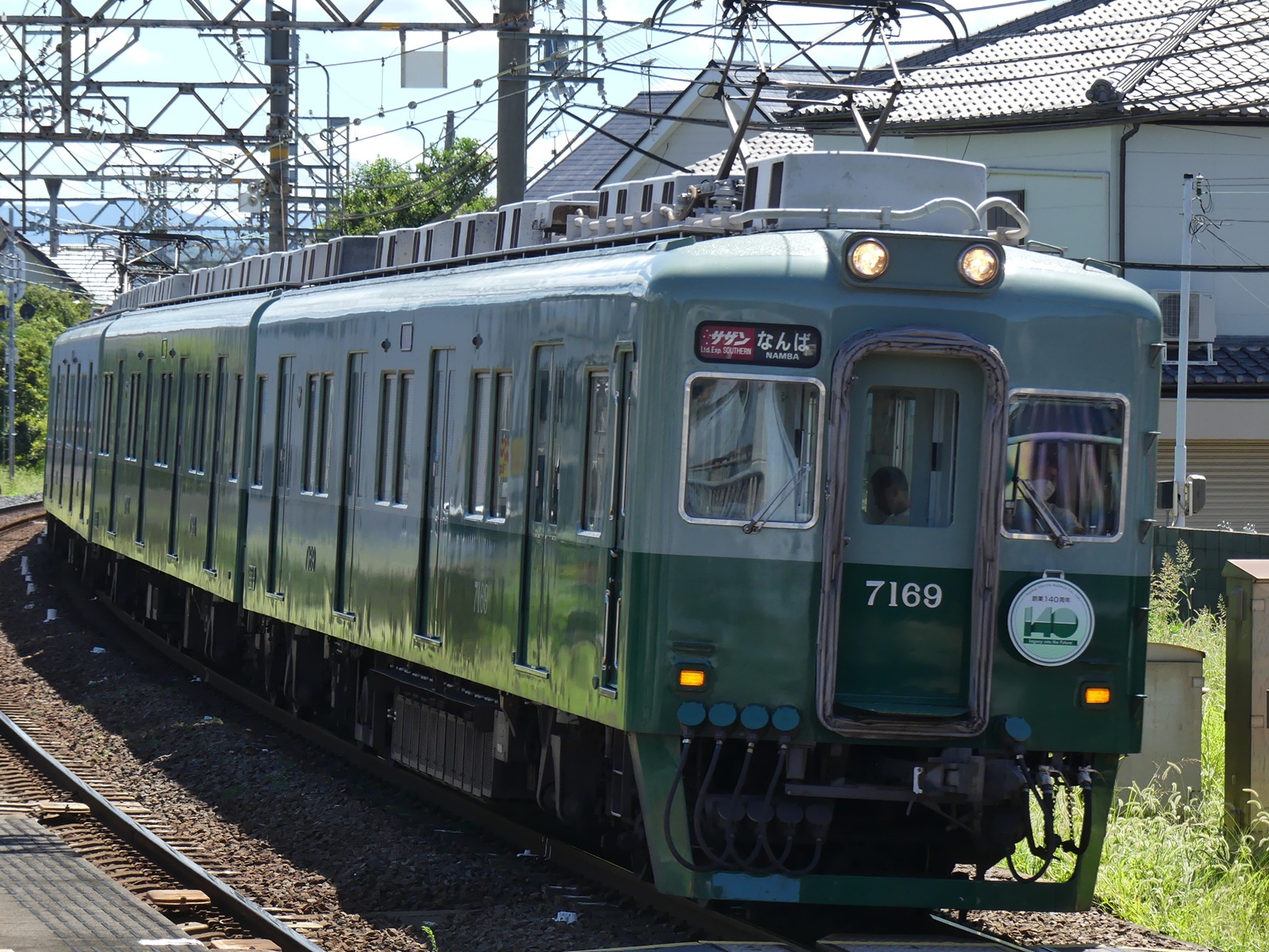 登場から現行CI導入まで纏っていた濃淡グリーンのツートンカラーに復元された7169F。7100系の登場55周年を記念し、2024年8月からこの姿で運用に入っている。同塗装のリバイバルは7000系の引退時以来である他、同時期には10000系のうち1編成も旧塗装に復元されており、運用によっては旧塗装同士の特急「サザン」を見ることができるようになった。