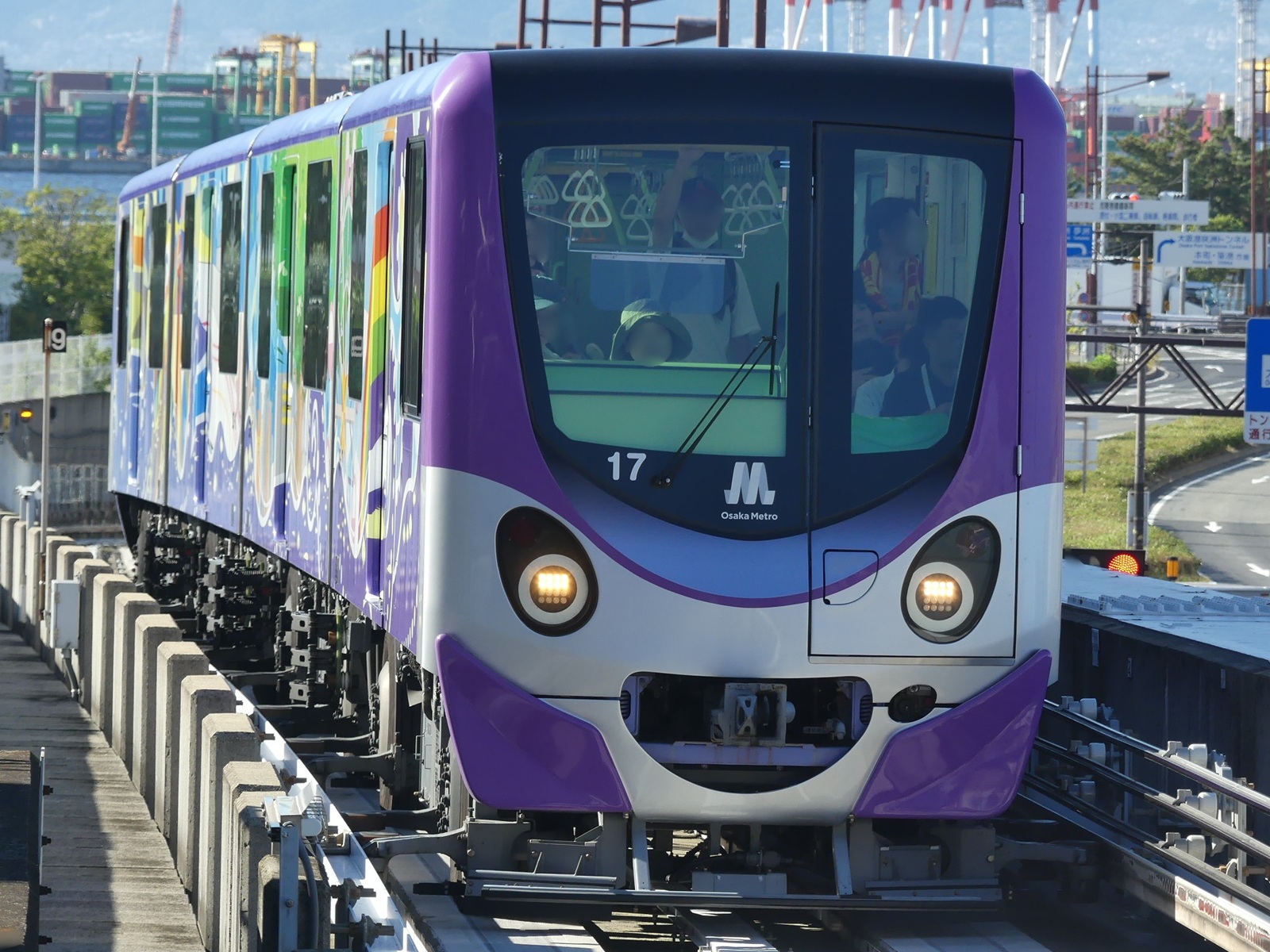 第17編成と第18編成の2本は、ニュートラム沿線にある大阪総合デザイン専門学校の学生によるイラストが側面に描かれ、前面はその色味に沿った色合いとなっている。「自然キラキラ、みんなワクワク」というテーマで、海辺の風景に交じり大型のタコの足が海に混じって描かれている。