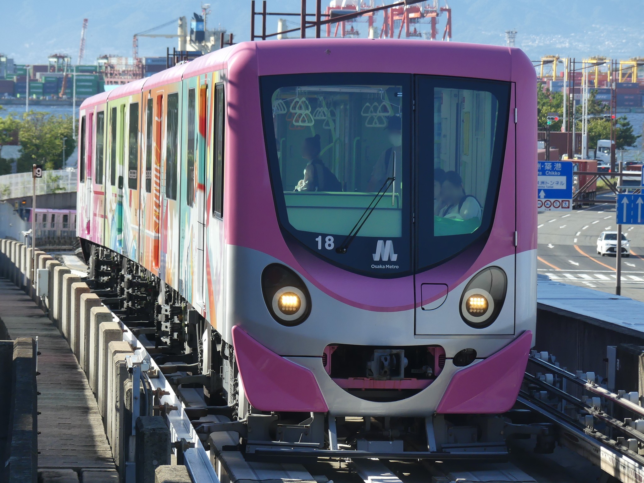 こちらは第18編成。こちらは「南港に羽ばたく子供たちと四季折々の景色」というテーマで、前面はピンク色基調となっている。