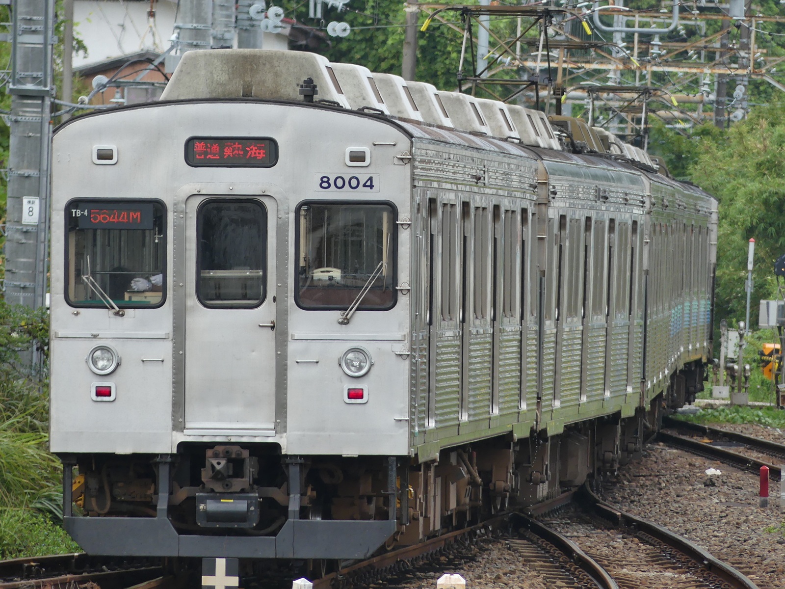 前面・側面の帯が撤去され、東急時代初期に近い姿となったTB-04編成。スカートも黒く塗装され、目立たないようになっている。2019年以降、8000系の複数編成で帯が撤去されてこの無塗装の姿となっている。
