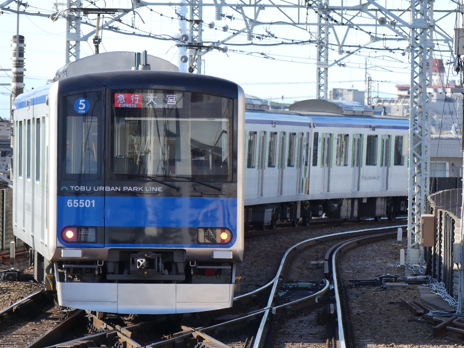 2013年登場。従来の野田線では8000系を使用していたが、製造から50年経った車両も存在し、その老朽化が顕著となっていた。そこで伊勢崎線・東上線から10030系の転用を行うと共に直接新造車両を投入して体質改善を図ることとなり、その目的の為に導入された通勤型車両が60000系である。野田線は本線系統から車両が転入する事例が多く、下回りまで含めた完全新製車の導入は、1944年まで総武鉄道が運営していた野田線が東武鉄道に編入されてからは初めての事例であった。既に本線系統に導入されていた50000系列をベースとしており、日立製作所製のA-Trainを採用しているが、こちらは基本色がフューチャーブルー(東武鉄道のロゴカラー」となり、扉付近に「ブライトグリーン」の線をあしらうことによって差別化がなされている。また前面はやや傾斜が入ったものとなり、50000系列と比べるとやや膨らみを増している。前照灯には東武鉄道で初めてLED灯が採用されており、これら要素も含め、50000系列とは印象が変わっている。制御方式はIGBT-VVVFインバーター制御方式となっているが、装置が従来車に比べて軽量化された他、主電動機が密閉式になり走行音の低減が図られており、また台車も構造が変更されている。また、東武鉄道の車両では初めてバックアップ制御が採用されており、万一1車両のブレーキが故障した場合、他車のブレーキ圧力を引き上げることで元の制動力を保つことができるようになっている。車内はオールロングシートで、化粧板を木目調とした他妻扉を全面ガラス張りにし、そこに沿線ゆかりの植物のイラストをプリントする等、従来車とイメージを一新するとともに、親しみやすさのある内装になっている。扉鴨居部には野田線の車両として初めてLCDを設置した他、照明は634型に引き続いて全てLED化したことで省電力化を図っている。尚、LED灯は当初ピンク系のものが採用されていたが、現在は白基調のものに変更されている。この他主幹制御器には野田線の車両で初めてT型ワンハンドルのものが採用され、計器類はグラスコクピットとしている。60000系は2013年6月に第1編成が営業運転を開始し、当初は久方ぶりとなる新型車両の導入という事で大きな話題になった。2013年度末には6連8本の陣容となる等増備が進んでおり、最終的には2015年までに6連18本の陣容となった。2023年の時点でも最終的に8000系の一掃までは出来なかったが、転入した10030系共々野田線に新風を起こしたといえる。なお、2024年以降野田線には更なる新車として80000系が導入されることになったが、新型車両は5連となる他、60000系の中間車1両を80000系へ転用することで、編成両数を5両で揃えることになっている。 2014,02,23 新船橋 |