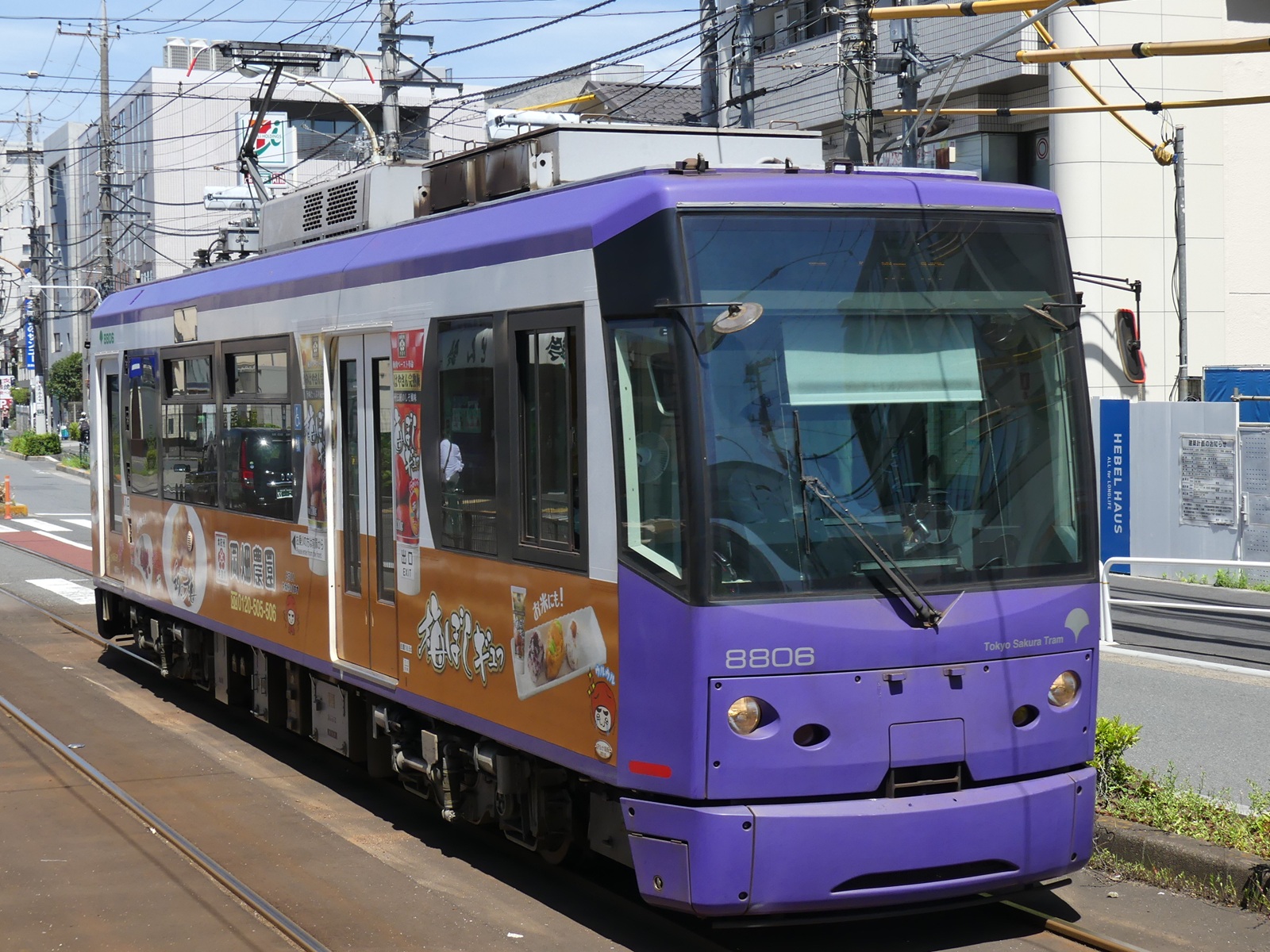 2009年登場。老朽化している7500形の置き換え用に製造された車両である。イベント用途を兼用していた9000形とは異なりこちらは一般車である8500形の後継車両と位置付けられており、デザインは3種類の候補の中から公募にて選ばれ「丸みのあるスタイルで優しさと親しみやすさをイメージ」したものとなった。塗装は沿線に咲いているバラをイメージしたものが採用されており、2009年度に製造された5両はローズレッドを基調とする塗装が採用された。2010年度に製造された車両は新たに3種類の異なるカラー(バイオレット、オレンジ、イエロー)となり、結果として4種類の塗装が存在する事になった。走行機器は9000形と同等であり、IGBT-VVVFインバーター制御車両となっている。車内においては液晶型の案内表示器を都電の車両としては初めて設置した他、表面に凸凹のついたスタンションポールや長さの違う吊り革等のユニバーサルデザインを採用している。座席配置は他車同様のセミクロスシートではあるが、クロスシート部は背もたれが拡大されている他、モケットはピンクを基調としたものとなり、沿線に咲くバラをイメージしたバラの模様が描かれている。次期都電の主力車両となる8800形は、2010年までに10両が配備され、7500形の全車両を置き換えている。以降は8900形の新造に移行しており、8800形の新造は終了している。 2009,06,14 荒川車庫前 |